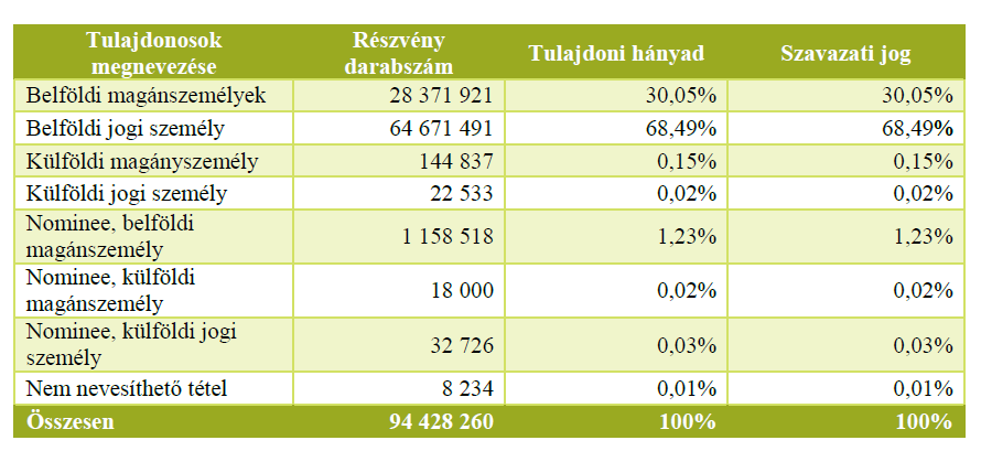 jelentésének (Jelentés1) 52. oldalán szereplő 15. számú táblázat (Kibocsátó tulajdonosi szerkezete (2023. december 31.) szerinti számadatok technikai okból a tördelési folyamat során elcsúsztak. Az így előállott hibát saját hatáskörben észlelve – egyben elnézést kérve a technikai okokból adódó hibás adatok publikálásáért – haladéktalanul korrigáljuk a helyes adatok megjelentetése útján.