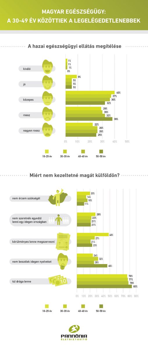 A CIG Pannónia felmérése szerint a 30-49 év közöttiek közel fele súlyos betegség esetén hajlandó lenne magát külföldön kezeltetni, és ennek a korosztálynak a képviselői a leginkább elégedetlenek a hazai egészségügyi ellátással. Bár a 18-29 év közöttiek valamelyest jobb véleménnyel vannak – ami korfüggő – 55%-uk azonban mégis inkább külföldön gyógyulna, ha komoly betegséget diagnosztizálnának nála.