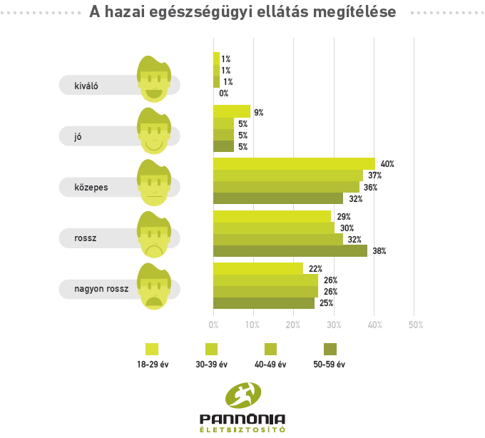 A CIG Pannónia korábbi felmérése7 kimutatta, hogy a hazai lakosság 57 százaléka elégedetlen a hazai egészségügyi ellátás színvonalával és a magyarok csupán 7 százaléka értékeli azt jónak. A kutatás szerint a 30-49 év közöttiek a leginkább elégedetlenek a hazai egészségügyi