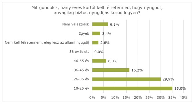 A jelenlegi nyugdíjkorhatár 64 év , így egy rövid számítás eredménye, hogy a megkérdezett korosztály a jelenlegi statisztikák szerint 35-39 évre van a nyugdíjtól. „Ej, ráérünk arra még!” – tartja a híres a mondás, a fiatal generáció azonban úgy tűnik, máshogy vélekedik. Habár nagy időtávlatokat említünk, az már mindenképpen tudatosodott a fiatalokban, hogy nem tétlenkedhetnek ez idő alatt, valójában nem érnek rá. A kutatás kitért arra, hogy hány éves koruktól kell a válaszadóknak félretenniük, hogy anyagilag biztosan teljenek a nyugalmazott napjaik. A résztvevők több mint harmada szerint 18-25 éves kortól kell erre a célra spórolni. A válaszadók 30 százaléka pedig úgy vélekedik, 26-35 éves kor között kell elkezdeniük takarékoskodni nyugdíjcélra.