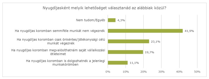 A kutatásban résztvevőket arról is kérdezték, szerintük hány évet fognak nyugdíjasként tölteni. A válaszadók több mint negyede véli úgy, hogy ez egy 5-10 éves intervallum lesz, további 22 százalék szerint hosszabb, akár 10-20 éves periódus is lehet. Ez idő alatt a fiatalok több mint 40 százaléka, ha tehetné, semmiféle munkát nem végezne. Közel negyedük önkénteskedne, vagy jótékonysági célú munkát végezne. A válaszadók 11 százaléka nyilatkozott úgy, hogy jelenlegi pozíciójában dolgozna tovább.